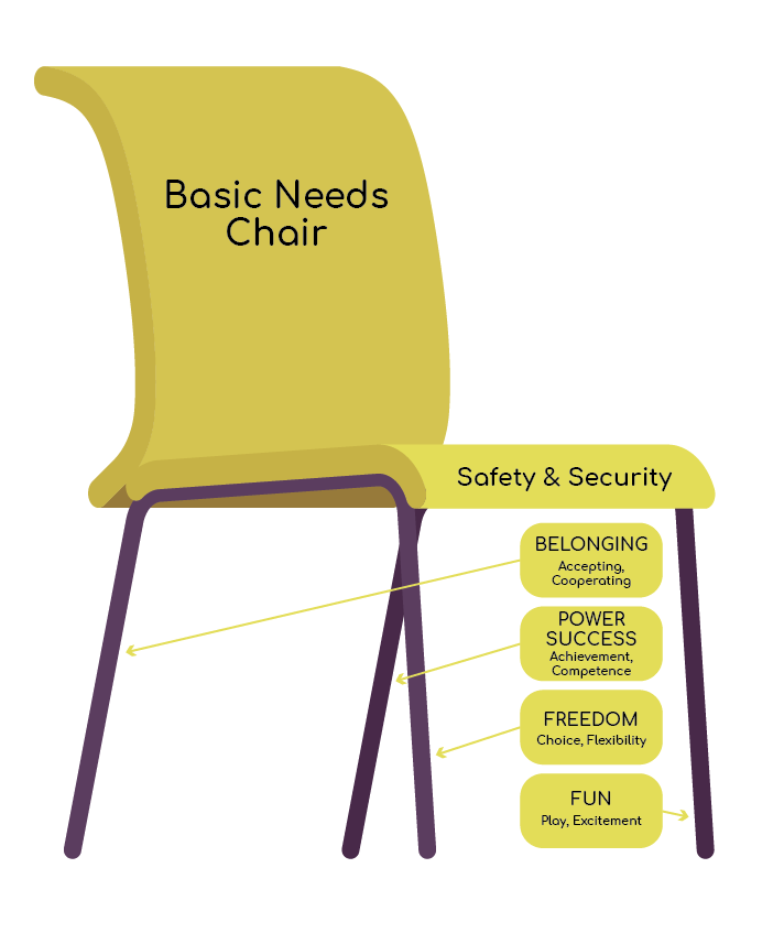 Our “Basic Needs Chair” tool supports self-awareness and agency by helping you reflect on the foundations of wellbeing. Inspired by William Glasser’s framework, the chair includes a seat, symbolizing Safety & Survival, and four legs representing Belonging, Power, Freedom, and Fun.